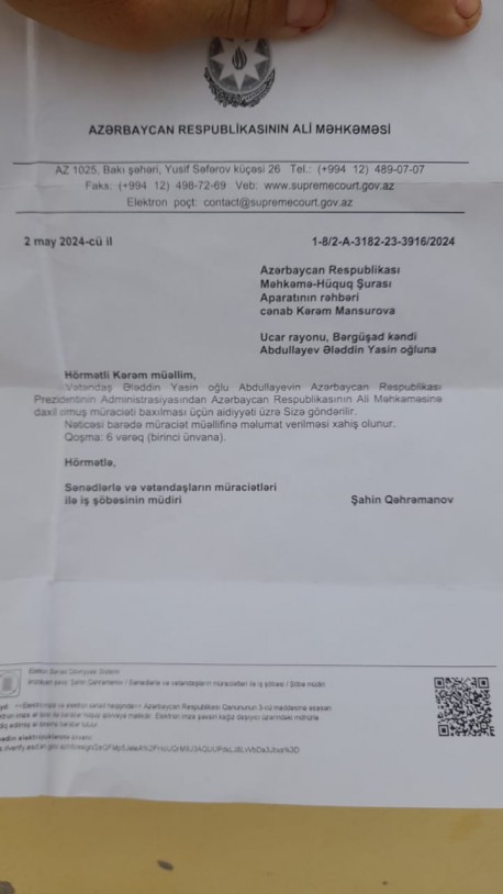 Ucar rayonu, Bərgüşad kənd sakini Abdullayev Ələddin Yasin oğlu tərəfindən Muxalifet.az-ın redaksiyasına şikayət məktubu daxil olub. Məhkəmə Hüquq Şurasının sədri İnam Kərimova müraciət edən şikayətçinin məktubunu olduğu kimi dərc edirik:
