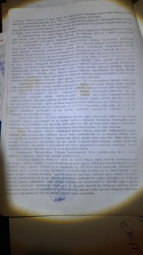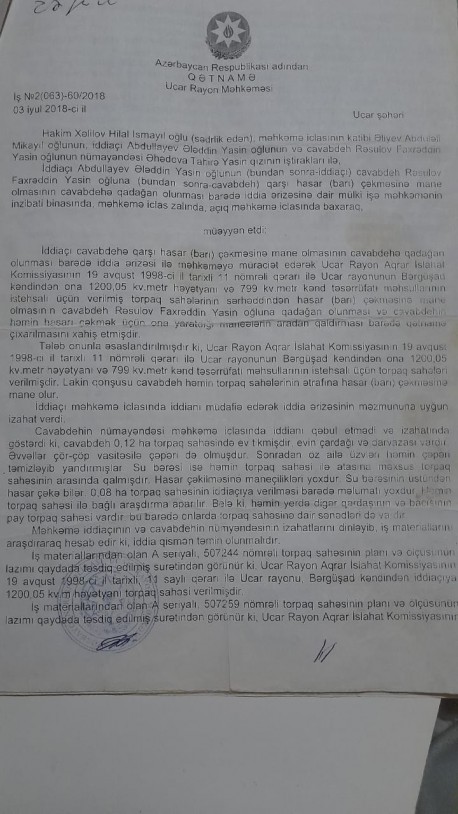 O, mənim iddiamı rədd edə bilmir. Ona görə ki, əlimdə kifayət qədər konkret subutlarım var. Belə ki, 2017-ci ildə mən belə iddia tələb ilə Ucar Rayon Məhkəməsinə müraciət etmişəm və Ucar Rayon Məhkəməsinin 2(063) -60/2018 saylı 03 iyul 2018-ci il tarixli qətnaməsi ilə mənim iddia tələbim təmin edilmişdir. Hal-hazırda olan məhkəmə mübahisəsində göstərilən predmet eynidir. Yəni eyni torpaqdır. Yalnız cavabdehlər fərqli adamlardır. O zaman cavabdeh başqa adam idi. Yəni hal-hazırda olan cavabdehlərin atası, əri və qardaşı idi. Bu şəxs dünyasını dəyişib.