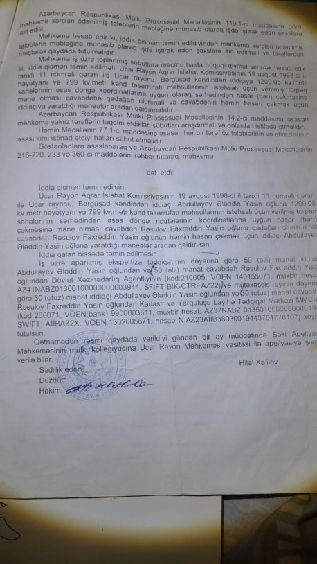 Belə ki, mən üç ilə yaxındır Ucar Rayon Məhkəməsinə iddia ərizəsi ilə müraciət edərək, Ucar rayon Bərgüşad kəndində yerləşən və mənə məxsus 1200,05 kvadratmetr həyətyanı və 799 kavadratmetr kənd təsərrüfatı təyinatlı torpaq sahələrinə hasar çəkilməsinə mane olmasının cavabdehlər Rəsulova Xanım Alı qızına, Rəsulova Şəfəq Faxrəddin qızına, Abdullayeva Nəzakət Yasin qızına və Əhədova (Abdullayeva) Tahirə Yasin qızına qadağan olunması və cavabdehlərin həmin hasarı çəkmək üçün yaratdıqları manelərin aradan qaldırılması barədə qətnamə qəbul etməsini xahiş etmişəm. Üç ilə yaxındır Ucar Rayon Məhkəməsinin hakimi Hilal Xəlilov yekun qərar vermir, müxtəlif bəhanələrlə məni süründürməçiliyə salır.