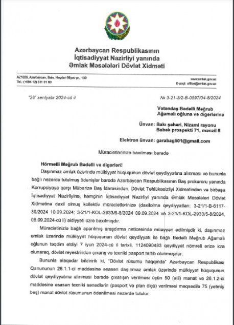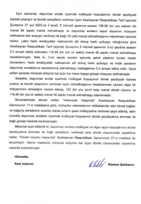 “Veteranlar haqqında” qanunun yalnız bir maddəsi Qarabağ veteranlarına tətbiq edilir , onu da Tarif Şurası ləğv edib. Qanunun 11-ci maddəsinə görə, müharibə veteranlarının istifadəsində olan dövlət bağları və bağçılıq sahələri ƏVƏZSİZ olaraq onların (müharibə veteranlarının) şəxsi MÜLKİYYƏTİNƏ verilir”. Bu ƏVƏZSİZ MÜLKİYYƏT hüququnu QEYDİYYAT ÇIXARIŞI (“kupça”) ilə gerçəkləşdirməyə borclu olan İqtisadiyyat Nazirliyi, yanındakı ƏMDX ( Əmlak Məsələləri Dövlət Xidməti) isə sözün gerçək anlamında dələduzluqla məşğuldur. Dələduzluq xidmətinə baxın, ƏMDX rəsmi məktublarla bildirir ki, əvəzsiz olaraq şəxsi mülkiyyətə verilmə hüquqların dövlət qeydiyyatına alınması demək deyildir. Tarif Şurasının 31.07.2023 tarixli qərarı ilə daşınmaz əmlakın dövlət qeydiyyatına alınmasına dövlət rüsumundan əlavə 236,96 manat xidmət haqqı müəyyən edilib və bu qərar QANUNDAN DA, KONSTİTUSİYADAN DA ÜSTÜNDÜR. (?) Bu absurdluğu bir ay DƏDKR-in rəis müavini Elvin Məmmədov, növbəti bir ay Elşad Məmmədov bildirib. Baş prokurorluqdan, DTX-dan, Korrupsiyaya qarşı mübarizə baş idarəsindən qanuna zidd olaraq rüşvətxorluğundan, korrupsiyasından şikayət edilən ƏMDX-ya göndərilən müharibə veteranlarının kollektiv şikayətini isə müavin Rüstəm Şahbazov 27.09.2024-cü il tarixli məktubla cavablandırıb. Əvvəllər də rəsmi məktublarla “JEK”-in, ƏMDK-nın hansısa məktubunun (?), şəhadətnaməsinin (?) , saxta-doğru “kupça”nın-qeydiyyat çıxarışının QANUNDAN, KONSTİTUSİYADAN, MƏHKƏMƏ QƏRARINDAN ÜSTÜNLÜYÜNÜ (?) bildirən Rüstəm Şahbazov yenə də ənənəsinə sadiq qalıb. Bu yekəlikdə xidmətin müavini yazır ki, əvəzsiz şəxsi mülkiyyətə verilmə hüquqların RÜSUMSUZ və XİDMƏT HAQQISIZ olaraq dövlət qeydiyyatına alınmasına əsas vermir. Çünki “ Dövlət rüsumu haqqında” qanunda müharibə veteranlarının bağlarının dövlət qeydiyyatına alınmasının dövlət rüsumundan azad edilməsi yazılmayıb. Qanunun aliliyinə, Konstitusiyanın ən yüksək qüvvəsinə saymazlığa baxın, bəs “Dövlət rüsumu haqqında” qanunda Tarif Şurasının qərarı ilə rüsum bəlirləmə yazılıb? Özü də bağ sahələrinə aid olmayan qərarla?