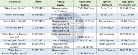 Onu da bildirək ki, yenidən təşkil olunduğunu elan edən “Arkoz İnşaat Şirkəti” MMC-nin dövlət büdcəsinə 263 min 944 manat 99 qəpik, ləğv olunduğunu elan edən “Arkoz Yol-Su Enerji” MMC-nin isə 6 min 321 manat 27 qəpik vergi borcu var. Bunlardan başqa “Arkoz” adı ilə fəaliyyət göstərən bir neçə şirkətin də dövlət bücəsinə vaxtında ödənilməyən vergi borcaları var: