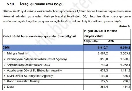 "APA-Economics" xəbər verir ki, 2025-ci il iyulun 1-nə olan məlumata əsasən, Azərbaycanın ümumi xarici dövlət borcu 5,01 milyard ABŞ dolları və ya 8,52 milyard manat təşkil edib. Bu borcun 41,9%-i birbaşa dövlət adından çıxış edən Maliyyə Nazirliyinin öhdəlikləri ilə formalaşıb. Nazirliyin payına 2,10 milyard dollar və ya 3,57 milyard manat düşüb.